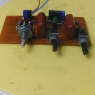 Originally I intended on incorporating an active mixer, however I found an eight channel, 2 output mixer for less money then I could buy the components. Also there is little room for a mixer section. Instead I elected to add a passive tone control section. The 47K Ohm logarithmic potentiometers are non matching as they are from a bag of mixed components I purchased many moons ago. The entire amplifier is built form stuff that was hanging around, with the exemption of the red paint, which I bought for the project.
