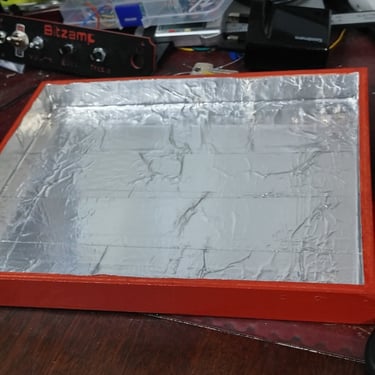 I painted the box red and lined it with aluminum tape. I assembled the little TDA2030 kit, which is configured for a 12V DC single ended supply. Fortunately, I had a Wombled a 12 Volt 2 Amp power supply that I used to power the amplifier.