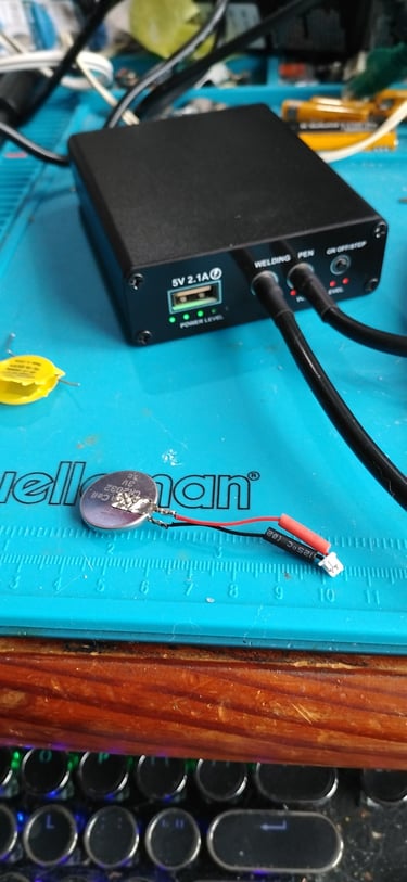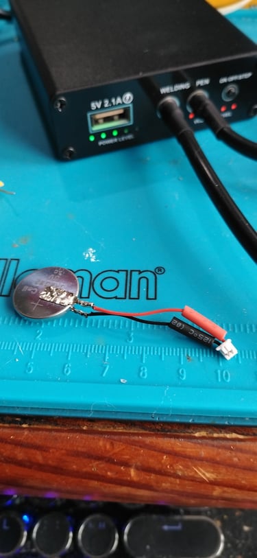 A day later I puled the nickel strip tabs from the original CMOS, and soldered the original connector. I added some heat shrink tuber to each lead to prevent the joins from shorting to anything else. Then I spot welded to reclaimed nickle strips to the CR2032 cell. After that I put a larger piece of heat shrink over the cell. Then I installed the new batter in the same location as the original. It is a tight fit but it works fine.