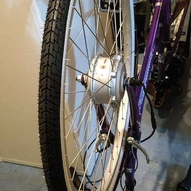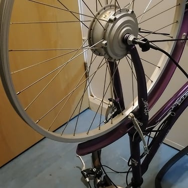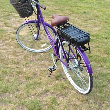 Update: The shop built "Pendelton Somerby Electric Cycle" was a tad too big for my wife, as was this home built bike. I purchased the same purple bike in a smaller frame and was about to transfer all of the kit off of this bike to the new frame for her. However, unfortunately we had all 5 bikes stolen along with my collection of guitar amps.